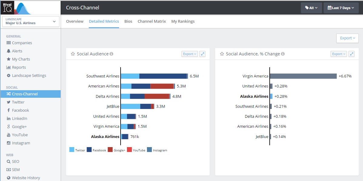 Use Rival IQ if competitive analysis is your priority, as it tracks how opposing brands perform on major social media platforms. The tool focuses on growth metrics — it records how audiences grow or shrink on weekly, monthly, quarterly and annual bases. By giving you access to historical data, you can correlate audience fluctuation to major events and business cycles to determine when and how rivals are expanding their fan bases.